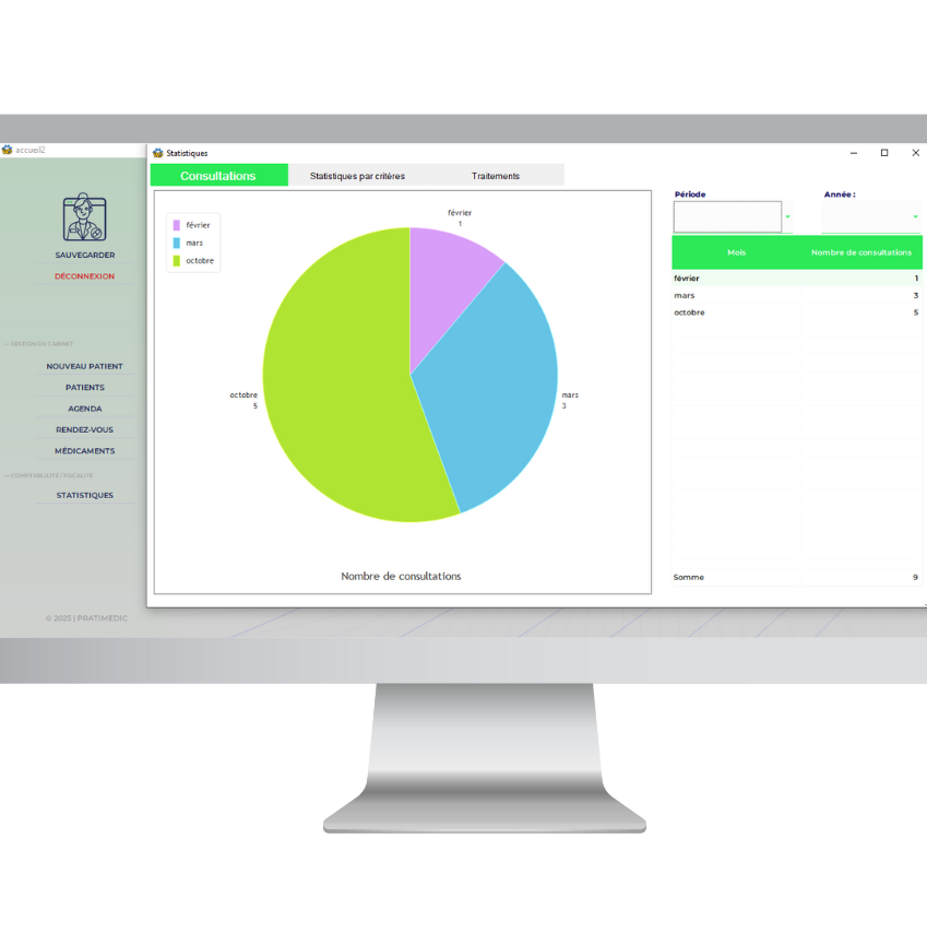 La fenêtre Statistiques vous permet de voir le nombre de consultations et la recettes réalisés selon la période choisie : année, semestre, trimestre ou dates précises.