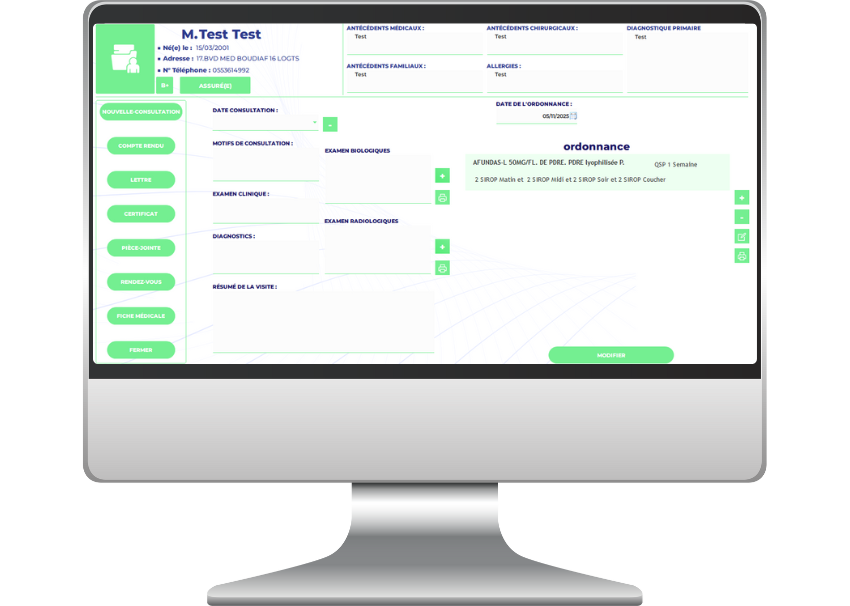 Une interface intuitive pour gérer les consultations, examens (biologiques et radiologiques), prescriptions et suivis patients. Conçue pour offrir au praticien rapidité, précision et confort d’utilisation au quotidien.